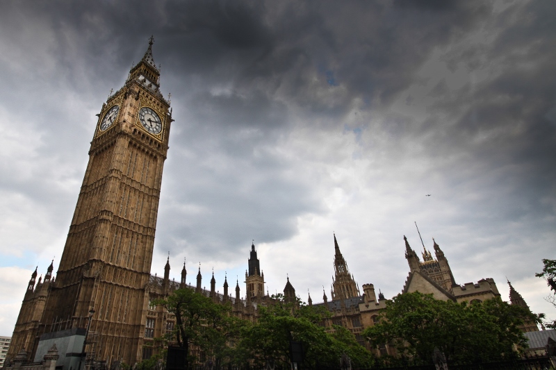 A storm’s a brewing. Westminster Palace looks dark and stormy on an overcast London day.