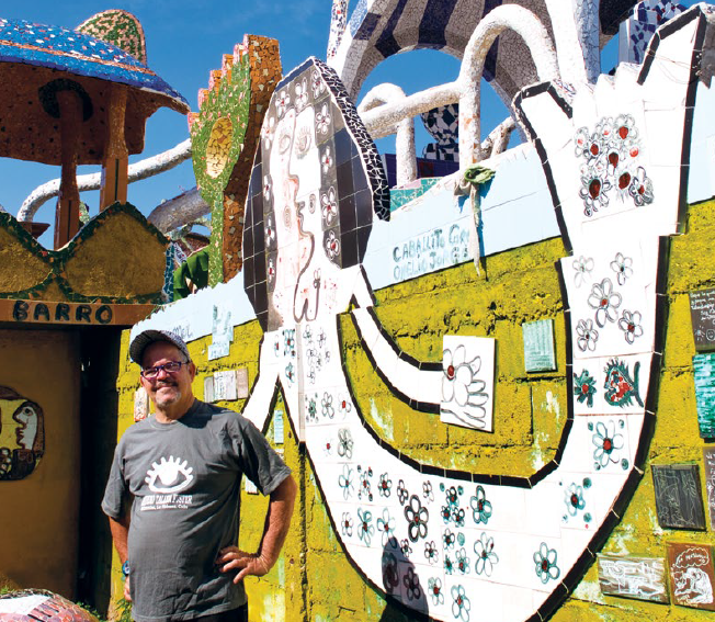 north coast of Cuba. Fuster began his career at 14 years old as a teacher with Cuba’s National Literacy Campaign in the Sierra Maestra. At 17, he attended Cuba’s first school for art instructors, Escuela Nacional de Instructores de Arte. As his career progressed, Fuster visited Europe to see the works of Gaudí, Picasso and Brâncuși. His travels and his homeland inspired his own unique artistic style, which combines the mosaic elements of Gaudí with the surrealistic style of Picasso’s naïve phase and the influences of Cuban culture, seen through his frequent portrayal of iconography inspired by Santería, rural animals, Che Guevara, and the Cuban flag. Fuster spends his supplemental income on artwork and repairs for his neighbor’s homes, putting most of his money back into the community he loves.