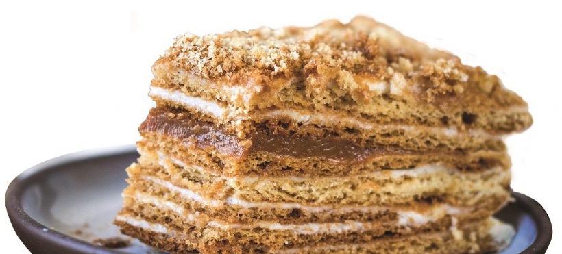 4. Add dulce de leche between each layer of dough, with ground walnuts added every three layers, saving one cup of walnuts for decoration. Cover cake with a thin layer of dulce de leche and sprinkle with a mixture of walnuts, powdered sugar and crumbs.