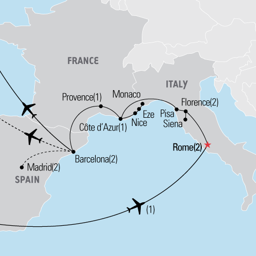 Retrace the steps of battle-ready gladiators on ancient Roman streets, visit indulgent resort towns on the sparkling Mediterranean Côte d’Azur, and join the colorful chaos and excitement on Barcelona’s mile-long pedestrian Las Ramblas.