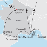 Travel from the sparkle of the Eiffel Tower to the glitter of the Mediterranean Sea. Nibble on croissants in Paris, surf at the “Queen of Beaches” in Biarritz, wander through a 13th century citadel in Carcassonne, and stroll down the promenades of Nice.